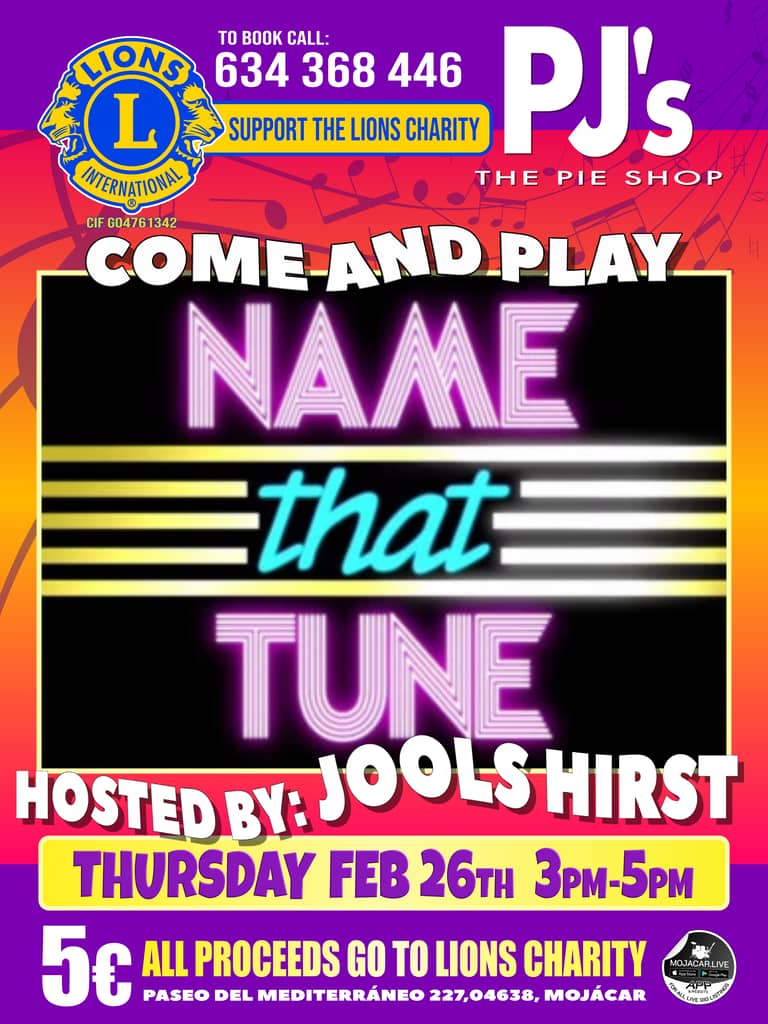 A special event at PJ's - Come and join the fun with Jools Hirst as your host, playing 'Name that Tune' - 5€ entry with all proceeds going to the Lions charity.