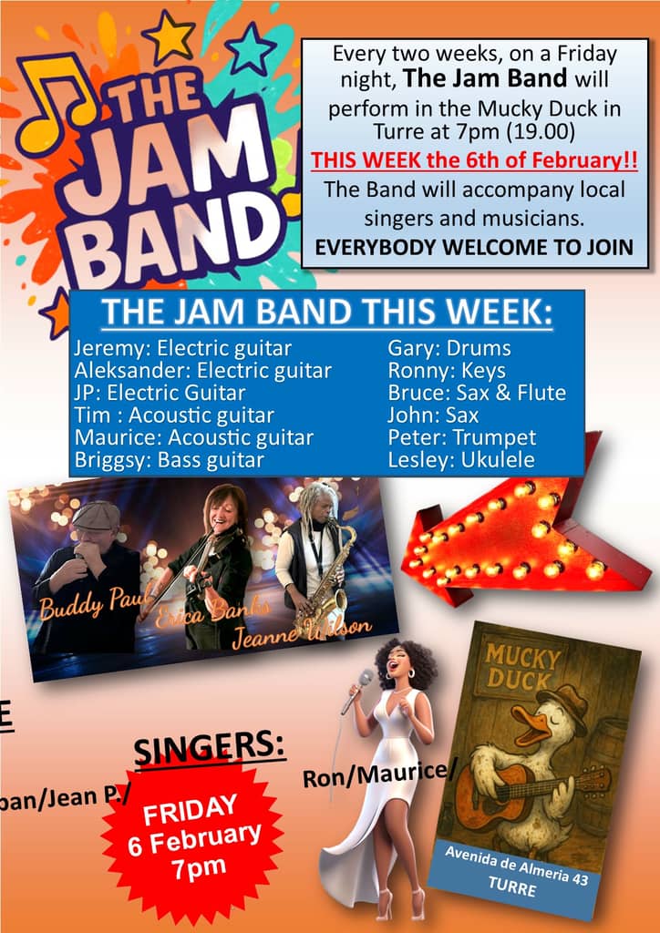 Every two weeks, on a Friday night, 'The Jam Band' will perform in the Mucky Duck in Turre at 7pm. The Band will accompany local singers and musicians. EVERYBODY WELCOME TO JOIN.